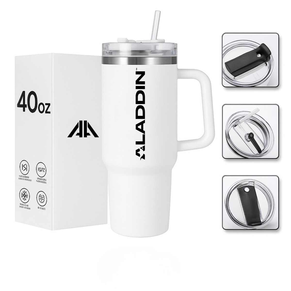 مطارة Aladdin Fitness 40oz Tumbler هي الحل! تصميم فخم وجودة استثنائية مصممة خصيصًا لتحفظ مشروبك في درجة الحرارة المثالية، لتزيد من تركيزك وأدائك سواء في الجيم، المكتب، أو أثناء السفر.