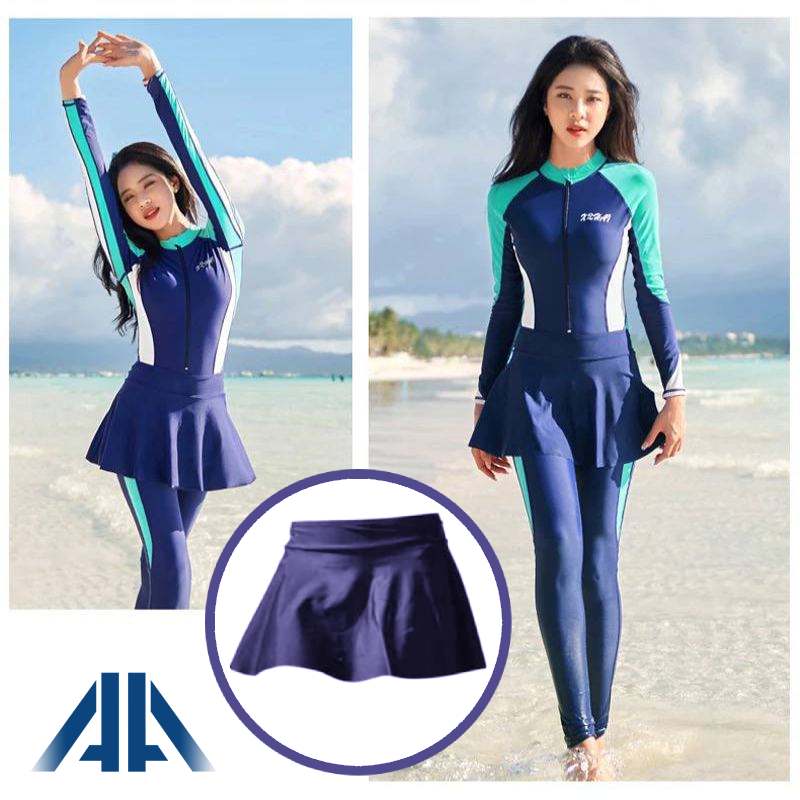 القطع: يشمل طقم السباحة الأساسي بالإضافة إلى تنورة متناسقة.